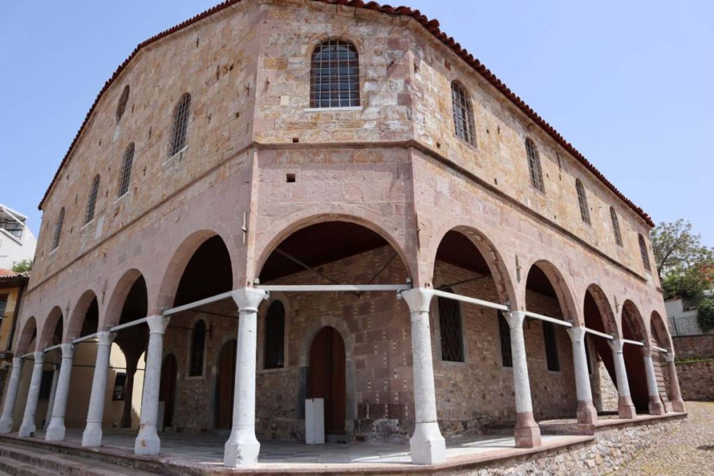 1850 yılında Rumlar tarafından yapılan Agios Yannis kilisesi aslında. Mübadeleden sonra camiye çevrilmiş. Konunun en üzücü kısmı ise Hristiyanlık’a ait freskolar (ıslak kireç sıva üzerine yapılan resimler) tahrip edilmiş. Kilisenin çan kulesini de saat kulesine çevirdikleri için adı Saatli Cami olmuş. 1944 yılında olan depremle çan kulesinin üst kısmı yıkılmış ama restore edilerek tekrar onarılmış.