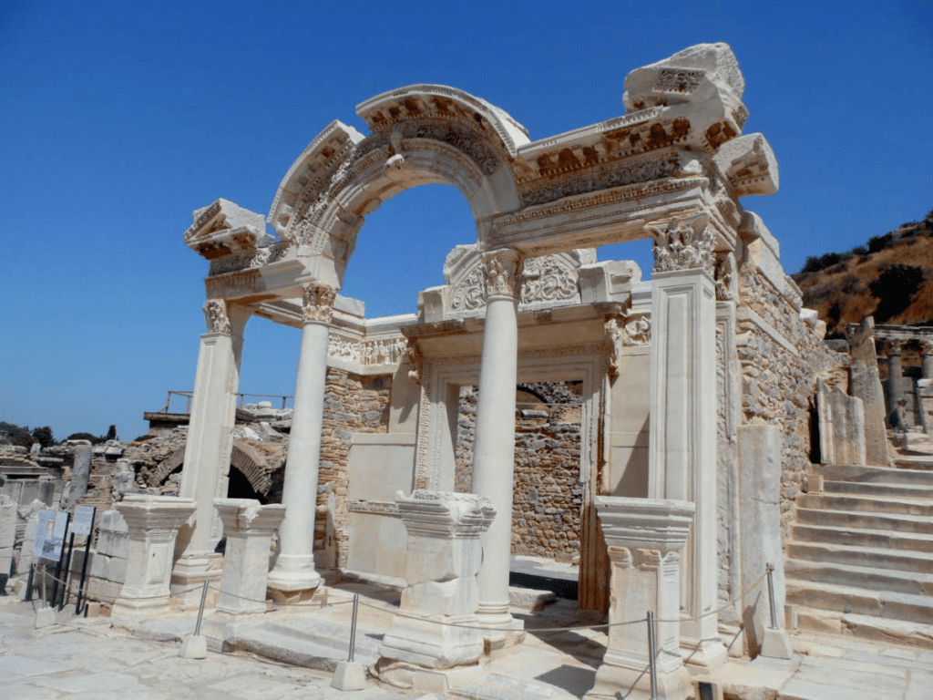 İlk bakışta “şirin bir yapı” gibi gelebilir ama aslında taş gibi mesaj veriyor: “Ben Roma’yım!” İmparator Hadrian adına M.S. 2. yüzyılda yapılmış bu tapınak, boyut olarak çok büyük olmasa da, üzerindeki detaylarla koca bir efsane anlatıyor. Özellikle ön cephesindeki kabartmalar göz alıcı. Efes’in kuruluş efsanesi, tanrılar, mitolojik figürler… Duvar nişlerinde zamanında Hadrian ve tanrılara ait heykeller yer alıyormuş. Bugün orijinallerin bir kısmı müzeye taşınmış ama yapı hâlâ estetik bir bütünlük taşıyor.