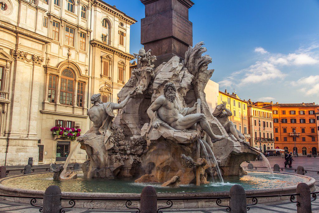 Meydan barok tarzının baş yapıtı olarak kabul edilmiştir. Mecazlar ve metaforlar yüklü çeşmedeki heykellerden elinde kürek olan, Asya kıtasını temsil eden Ganj nehrinin tanrısıymış ve kürek ile bu nehrin deniz trafiğine uygunluğuna işaret edilmiş. Kafasına kumaş kaplanmış olan, Afrika’yı temsil eden Nil nehrinin tanrısıymış ve heykelin kafa kısmındaki bu gizlenmişlikle, Nil nehrinin kaynağının kimse tarafından net bilinmemesi (gizli kalmışlığı) ilişkilendirilmiş. Papa’nın armalarına dokunan heykel, Avrupa kıtasını temsil eden Tuna nehrinin tanrısıymış. Bu nehir Hrıstiyanlığın kalbine en yakın nehir olduğu için böyle tasvir edilmiş. Yılan gördüğü için korkmuş ifadesi olan ise Amerika kıtasını temsil eden Gümüş nehrinin (Rio de la Plata) tanrısıymış ve yüzündeki ifadeyle Amerika’daki zenginlerin paralarından çalınmasından korkmalarına atıfta bulunulmuş. lmaktadır.