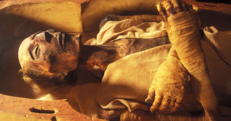 V. Mumyanın başı ve vücudu yağın içindeki keten kumaşla sımsıkı paketlenir, böylelikle Mısırlılar mumyaladıkları kisinin hayattaki halini yeniden elde etmek isterler.Mumya altın, kolye, yüzük, bilezik ve mücevheratlarla birlikte kapatılırdı.