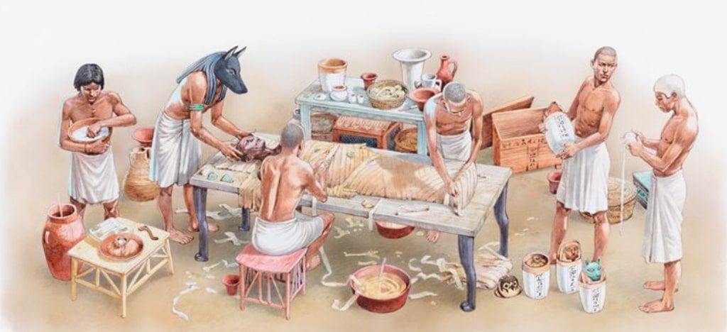 Mısırlılar, ölülerinin ruhlarının öteki dünyada dirilip yeniden bedenlerine döneceklerine inanırlardı.Bu nedenle bedenlerinin sağlam kalması amacıyla mumyalama işine büyük önem verirlerdi.Mumyalama işleminden önce ölen kişinin cesedi 3 gün bekletilir, daha sonra vücut güzel bir şekilde temizlenirdi.