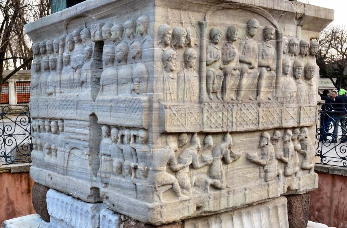 Dikilitaş’ın oturtulduğu kaide Roma izleri taşıyor. Dikilitaş’ın kaidesinin iki yüzüne, o dönemde Roma imparatorluğunun doğu eyaletlerinde adet olduğu üzere Grekçe ve Latince kitabeler yazılmış. Bir yanda Sütun’un İstanbul’a getirilişi ve Sultanahmet meydanındaki hipodrom içine dikilişi; diğer yanda ise meclis ya da senato resmedilmiş.