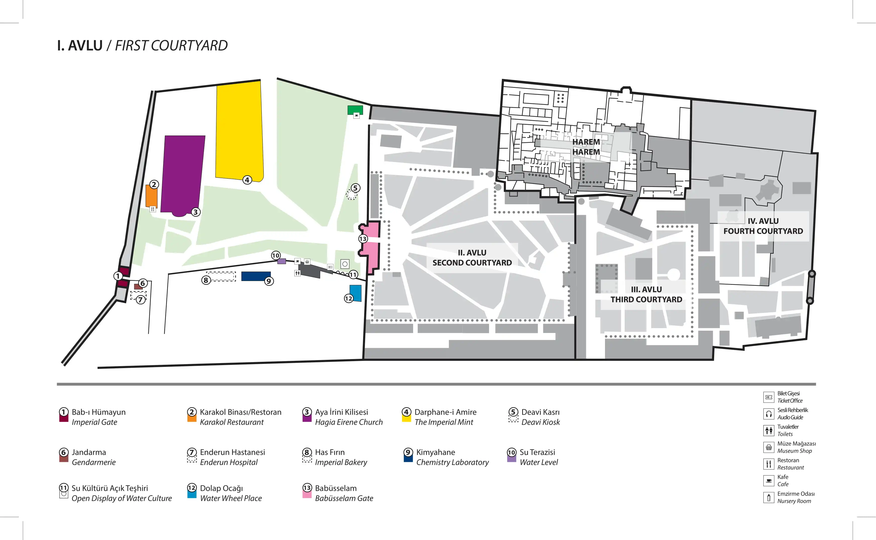 Bab-ı Hümayun’dan girer girmez karşımıza çıkan geniş alan 1.Avlu. Birûn denilen dış hizmet yapılarının bulunduğu I. Avlu, Saray’ın en geniş avlusu. Osmanlı padişahları sefere gidiş ve dönüşlerinde, Cuma Selamlığı gibi törenlerde bu avludan ihtişamla geçermiş. Saray’ın diğer bölümlerinin aksine halk bu avluya girebilirmiş. Kapının üstündeki yarım hilal şeklinde hat, müsenna denilen aynalı yazı şeklinde yazılmış. Yani ayet ortadan ikiye ayrıldığında iki tarafı da aynı.